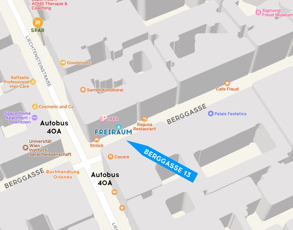 Wir nützen diesen Standort auch für viele, nicht aber für alle Ausbildungen aus unserem Angebot: bitte vor der Anreise nachsehen (Buchung-Bestätigung, Stundenplan,… ), ob du in die Berggasse 13 oder doch zu einem anderen Standort von uns kommen sollst!